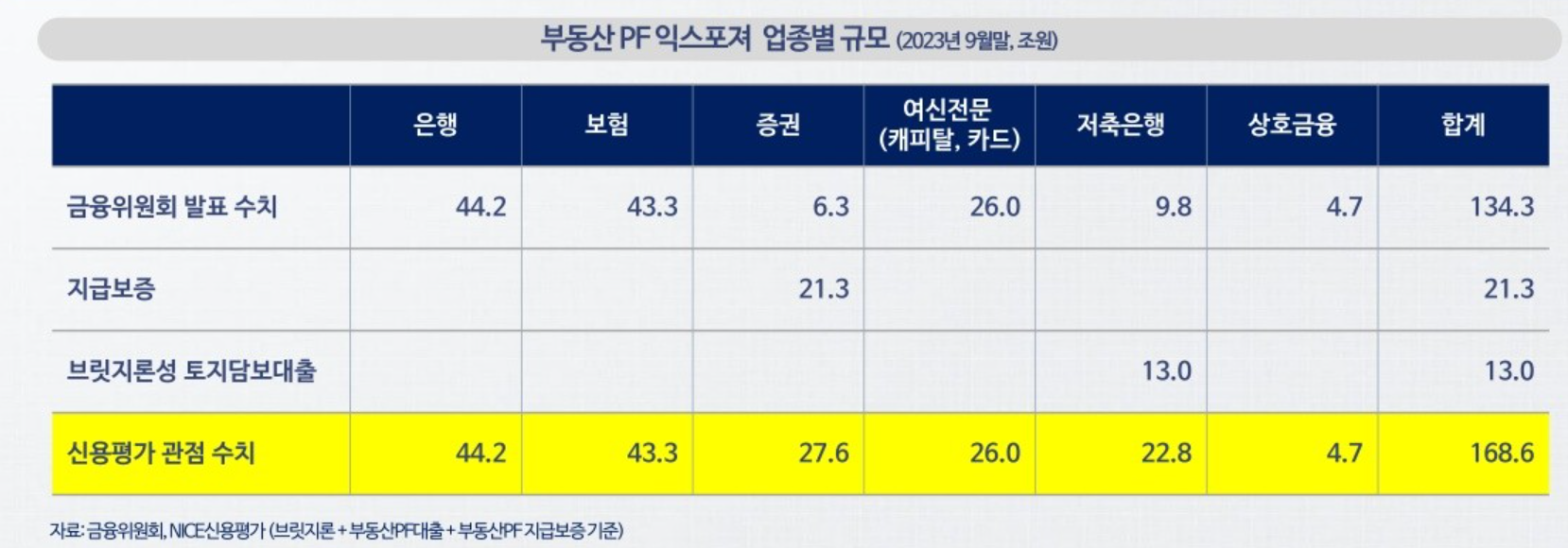 ( #신용평가 관점에서는 증권은 +지급보증 21조 원 / 저축은행은 +브릿지론성 토지담보대출 13조 원씩 가산 )